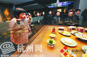 本报讯 了解杭帮菜历史、再现“杭州将军府满汉全席”、到博物馆拜师学艺……昨天下午,中国杭帮菜博物馆正式开馆啦!与普通博物馆不同的是,这家博物馆不仅能看、能玩,还能边吃边学。 300道“菜品”以假乱真 诸多历史名宴再现 杭帮菜博物馆分两层展区,由专业展陈馆、“钱塘厨房”、“杭州味道”和“东坡阁”四大区域组成。利用科技手段,综合文字、实物、模型、雕像、场景等多元要素,生动展示了从良渚时期到现代社会各个时代杭州人的日常饮食,活脱脱一部生动的杭帮菜史。 一圈看下来,馆内300道菜品和点心模型真当诱惑人,其制作工艺精良,惟妙惟肖,难分真假。特别值得一提的是,一些大家耳熟能详的历史名宴都得到了“真实”还原,如“康、乾南巡御膳”、“杭州将军府满汉全席”等,简直让人大饱眼福,口水直流。 在“钱塘厨房”馆的百姓厨房内,有中西式糕团点心制作互动区、杭州街头小吃“八大担”绘画展示等,并设有菜谱查询机供游客阅读。此外,如果想看看古人吃饭的器具什么样,或了解历史上的名人与杭帮菜的故事,比如苏轼当年举办诗酒会,招待客人的菜肴?博物馆里也有详细介绍。 寻找“杭州味道” 十大举措惠及市民游客 中国杭帮菜博物馆免费向市民和游客开放。在馆内市民不仅能欣赏到让人垂涎欲滴的仿真菜,还能边游览,边“点单”,再到经营餐厅亲口感受下杭帮菜的美味。 作为开馆“福利”,中国杭帮菜博物馆还推出了十项长期惠民举措。其中包括:设立杭州图书馆杭帮菜博物馆分馆,并免费开放;开辟青少年“第二课堂”,为青少年免费提供打年糕、磨豆浆、做麻糍等体验场所和服务。 每月10日定为“市民学艺日”,组织有兴趣的市民朋友到博物馆向杭帮菜名厨大师学做杭帮菜;每月20日为“市民品尝日”,开辟市民品尝区,邀请50名市民免费品尝杭帮菜名菜名点;每月最后一周为“名店名菜展示周”,邀请杭州各大餐饮名店依次到博物馆设点,展示名菜,并向市民提供7折优惠。 此外,还设立“123小吃一条街”,每月1日、2日、3日,在博物馆内向市民推出每份售价分别为1元、2元、3元的杭城街头小吃。