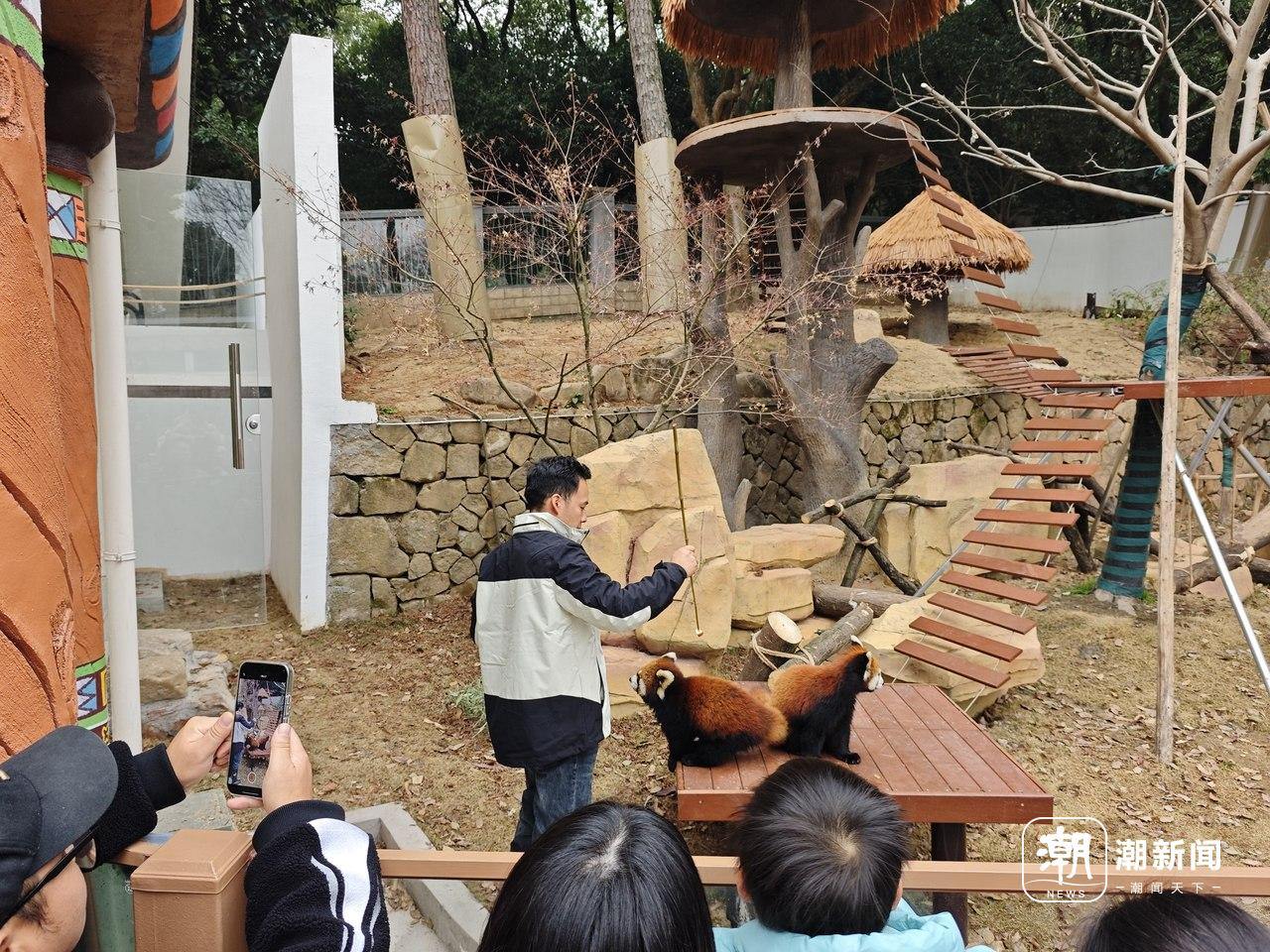 上午10点多,正好是小熊猫的进食时间。动物园最深处的小熊猫之家,早已被游客围得里三层外三层,有游客把手机举过头顶,还有宝爸将年幼的孩子扛在肩膀上。