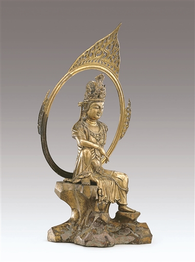 这尊水月观音高53厘米,整尊观音头戴高冠,冠上饰化佛,身佩璎珞,左臂撑岩,右臂置膝;左腿下垂,右腿上曲足踏岩石;安坐于山岩之上,身旁石上置一净瓶,身后一圆轮状大背光,浑圆精美,边缘装饰火焰纹,仿佛岩前有潺潺流水,观音目观水中月影。整尊观音造型优美自然,神态宁静安详,意境超凡脱俗。